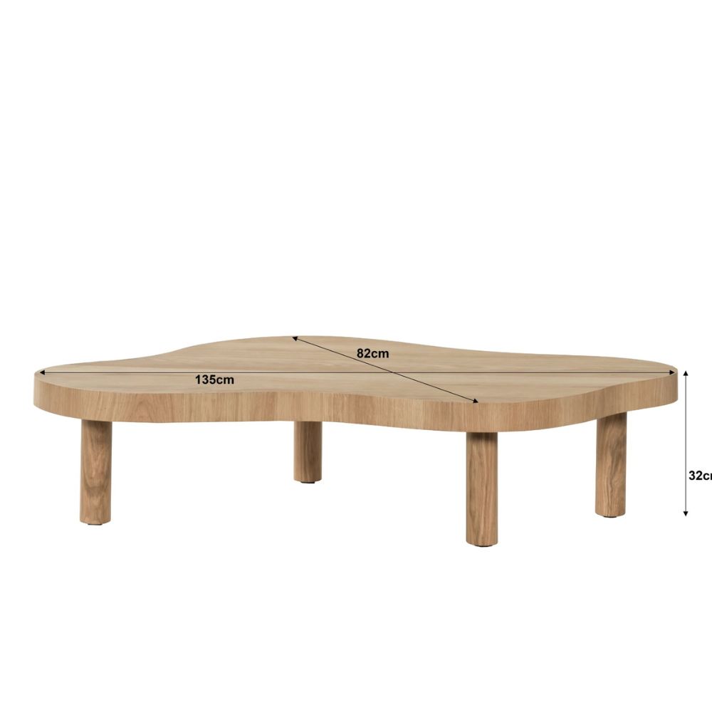 De SJ Tobago Salontafel Naturel 135 cm is een stijlvolle blikvanger met een zachte, organische uitstraling. Deze salontafel is vervaardigd uit hoogwaardig eiken fineer en uitgevoerd in een warme naturel houtkleur, waardoor het natuurlijke karakter prachtig naar voren komt. Het unieke organische / wolkvormige blad zorgt voor een speels en modern design. Dankzij de afgeronde vormen oogt de tafel luchtig en harmonieus in de woonkamer. Met een lengte van 135 cm biedt de salontafel voldoende ruimte zonder te overheersen. De stevige poten zorgen voor stabiliteit en een rustige uitstraling. Deze salontafel past perfect binnen Japandi, Scandinavische en moderne interieurs.